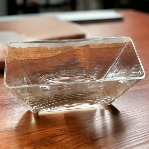 En ældre høj og firkantet glasvase fra midten af 80erne med et fint optisk asymetrisk bølget stribe mønster– perfekt til at huse en buket blomster eller et par grene. Vil også være fint til opbevaring af en stensamling, glasperler mm.