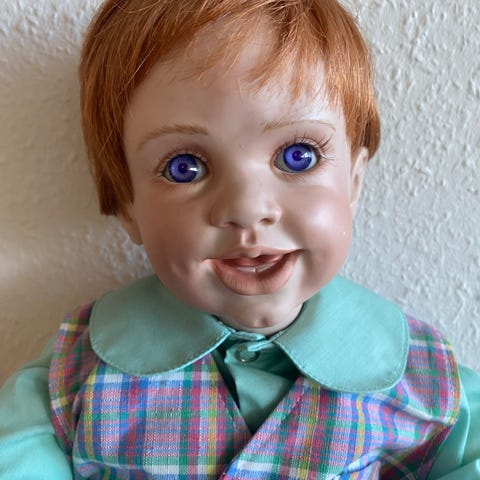 Detaljer: Paryk af ægte menneske hår og øjne der kan åbne og lukke.