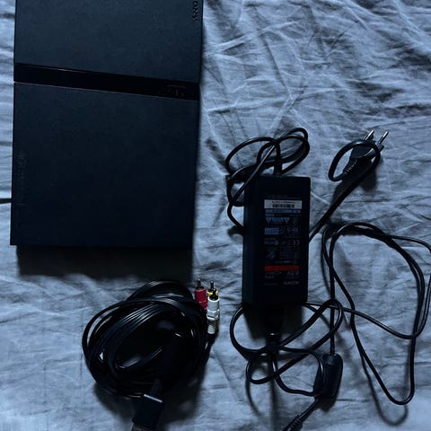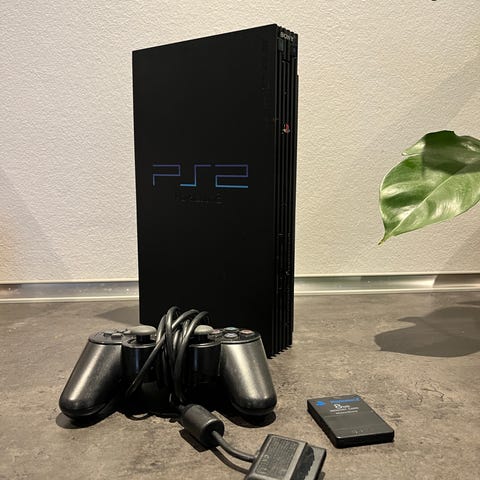 Sony Playstation 2 konsol i sort. Klassisk stationær PS2-model med frontindgang til controllere og hukommelseskort samt tilslutninger til strøm og AV på bagsiden. Egnet til afspilning af Playstation 2-spil og kompatibel med originale PS2-controllere og tilbehør.