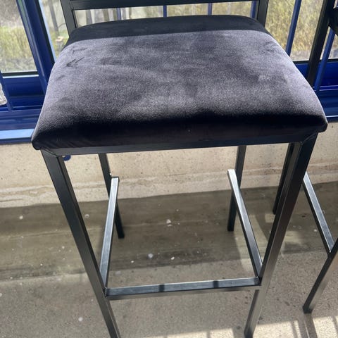 2 sorte barstole der kan reguleres i højden. Der er sort betræk på stolene, stolene er brugte, men i fin stand uden synlige pletter.