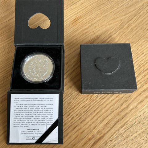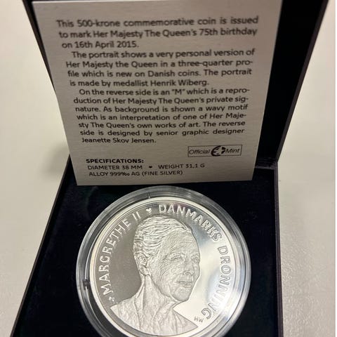Den Kgl. Mønt Margrethe II 70-års fødselsdag 500-krone sølvmønt. Jubilæumsmønt udgivet i anledning af Hendes Majestæt Dronning Margrethe II’s 70-års fødselsdag i 2010. Forsiden viser portræt af dronningen med teksten "Margrethe II Danmarks Dronning", mens bagsiden har årstallene 1940 og 2010, rigsvåben og pålydende værdi 500 kroner. Mønten leveres i original æske fra Den Kongelige Mønt med specifikationskort.