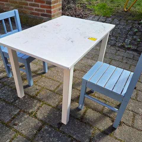 H&M børnebord med 2 stole sæt i beige. Sættet består af et rektangulært bord og to matchende stole i samme farve. Overfladen fremstår glat med enkelte mindre brugsspor. Egnet til børneværelse eller legeområde til aktiviteter som tegning, leg og mindre måltider.