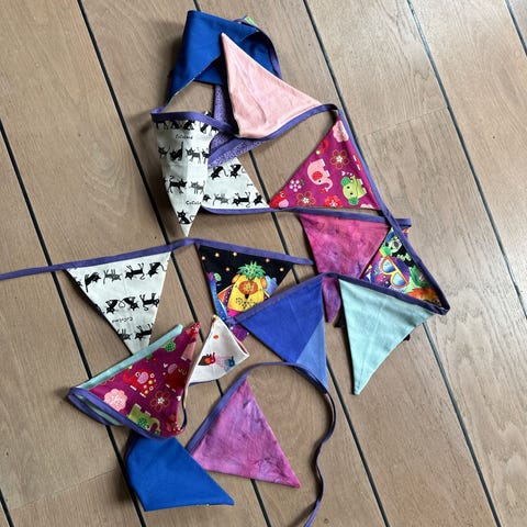 Flagranke med stofflag i trekantet form. Flagene er i forskellige mønstre og nuancer, primært i blå og flerfarvede print. Guirlanden kan bruges som pynt til andre højtider, børneværelse eller festlige lejligheder. Materialet fremstår som tekstil med påsyede flag på et bånd, klar til ophængning på væg, reol eller over døråbninger. Længde: ca. 3,5 meter