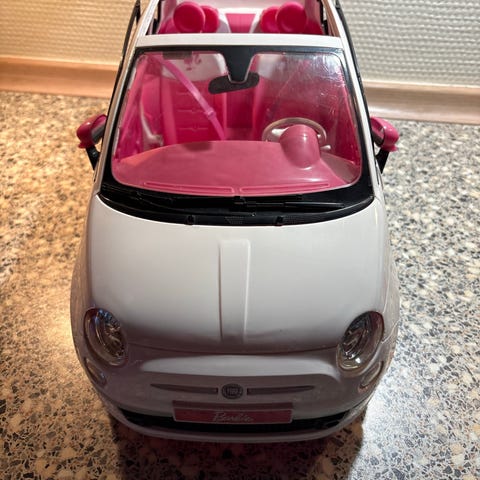 Barbie fjernstyret legetøjsbil med tilhørende tryllestav i pink som fjernbetjening. Bilen har åbent tag, to sæder og store hjul i sølvfarvet plast. Tryllestaven er formet som en stjerne og er ligeledes i pink. Sættet er egnet til leg med dukker og barbiedukker i tilsvarende størrelse og kan bruges til rolleleg og fantasilege indendørs.