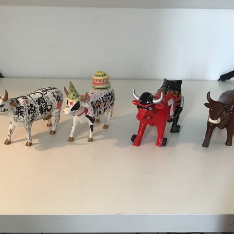 CowParade ko figur med struds-motiv i flerfarvet design.