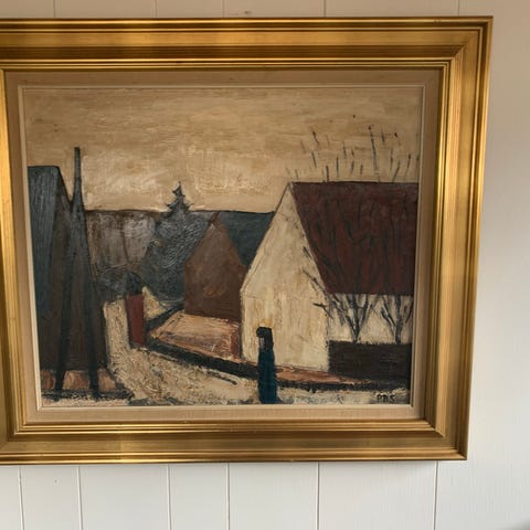 V. Albertsen - Maleri med motiv af landsby og vej omgivet af huse, hegn og træer. Billedet er udført i farver med fokus på detaljer i bygninger, natur og himmel. Maleriet er indrammet i en profileret guldfarvet ramme. Velegnet som vægdekoration i stue, gang eller andre opholdsrum. Kunstnerens signatur fremgår nederst på lærredet. 60x70 cm.