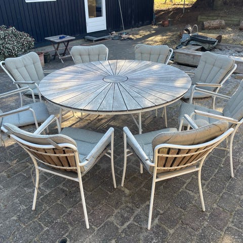 Rundt havebord i teaktræ med klapfunktion samt to tilhørende havestole i teaktræ med armlæn og 5 position. Bordet har lamelopdelt bordplade og fremstår i vejrpatineret teaktræ. Stolene er justerbare klapstole med højt ryglæn og lyse, polstrede hynder. Sættet er egnet til udendørs brug på terrasse eller altan.