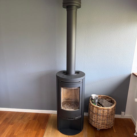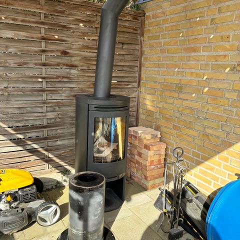 Brændeovn med fedtstensbeklædning og buet glaslåge inkl. gulv glasplade. Ovnen har stor frontlåge med glas, der giver godt indkig til brændkammeret. Indvendigt ses ildfast foring og rist i bunden. Fedtstenssiderne fungerer som varmemagasin, der kan holde på varmen over længere tid. Egnet til opvarmning af opholdsrum i bolig eller sommerhus, hvor der ønskes synlig ild og konvektionsvarme fra en fritstående brændeovn.