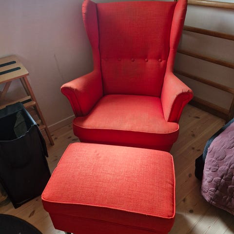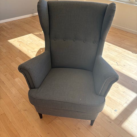 IKEA Strandmon lænestol - i sandfarvet tekstil. Høj ryg med vinger og knapper i ryglænet. Polstrede armlæn og løs sædepude. Stolen står på lyse træben. Egnet som læse- eller hvilelænestol i stue eller opholdsrum. Fremstår næsten som ny. Nypris Kr. 1.900,-
