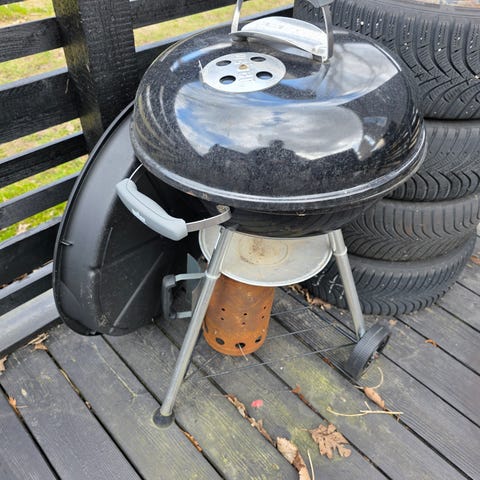 Weber kuglegrill til kul 57 cm. Inkl. grillstarter og krog til at hænge grilltang mv. på. Sidebord/skærebrædt aldrig brugt følger også med.