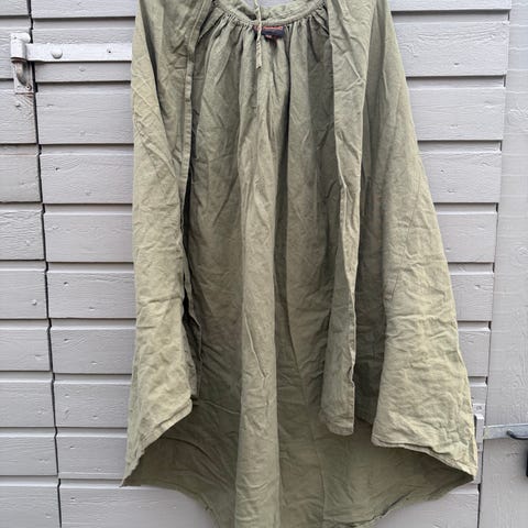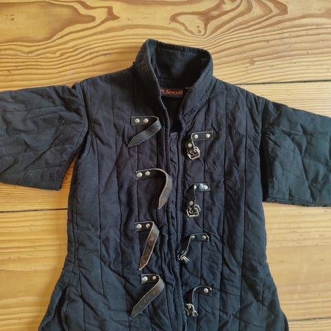Mytholon lang quiltet frakke i sort med læderspænder og metalringe på fronten. Modellen har korte ærmer og går ned under knæet. Jakken er i str. M og længden er fra top til bund ca. 105 cm lang. Til rollespil og kan bruges som yderlag, fx til udklædning, under en brynje eller lignende brug. Passer til en 10-12 årig