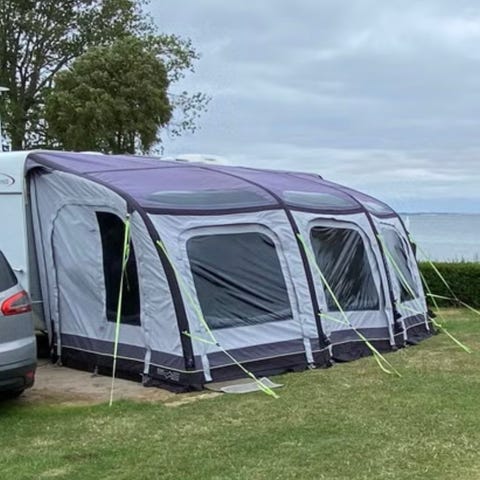 Næsten nyt luftfortelt, har kun sat det op for foto. Det fulgte med campingvognen ved køb, det er virkelig pænt, ingen brugsspor. Det er et autwell mirage 400 sa