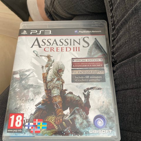Ubisoft Assassin’s Creed III Playstation 3 spil. Action-adventurespil på Blu-ray til PS3 med PEGI 18-mærkning. Spillet foregår i et historisk miljø og understøtter singleplayer. Leveres i original plastboks med cover og spil-disk til Playstation 3-konsol.