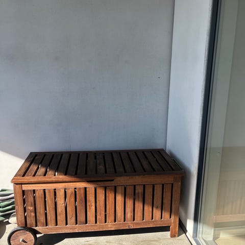 Helt ny, live købt, men vi har fortrudt, da vi ønsker noget andet og mindre. Også i forhold til vores lille dreng, så han ikke springer over kanten på altanen ;)