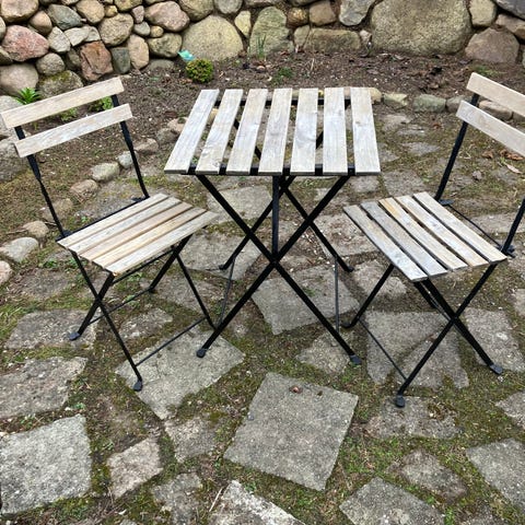 Cafésæt bestående af rundt bord og to stole i metal. Sættet er i blå farve og egner sig til brug på terrasse, altan eller i have. Bord og stole har lameller i sædet og på bordpladen samt slanke ben, der giver et let udtryk. Velegnet som mindre udendørs siddeplads til to personer.