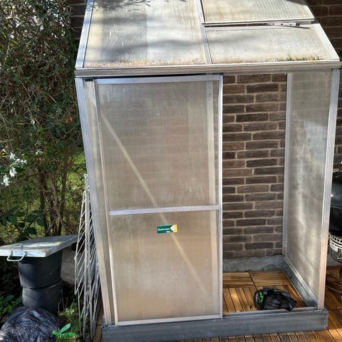 Den ene rude røf i en storm i vinter og er pillet ud. Alle ruder er kittet i og efterfølgende malet sort. Drivhuset fremstår ældre end det er da jeg byggede det for at se gammelt ud. Drivhuset er 4 år gammelt.