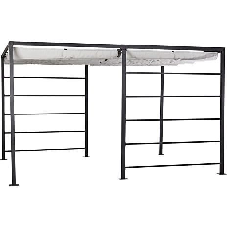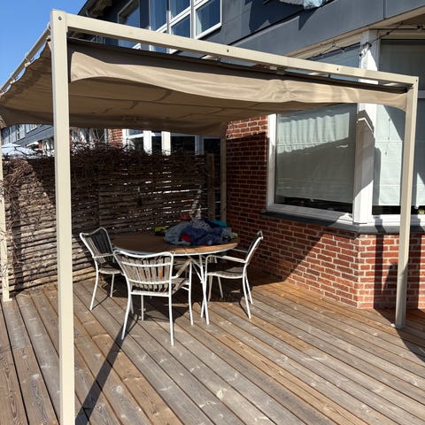 Pergola terrasseoverdækning med skydetag i grå farve. Konstruktionen består af stolper og tværbjælker, hvorpå der er monteret et fleksibelt tag i stof, som kan trækkes ud og ind efter behov. Overdækningen er egnet til placering over flisebelagt terrasse og kan give skygge over spise- og opholdsområde udendørs. Velegnet til brug ved havemøbler, grill og andre terrasseaktiviteter.
