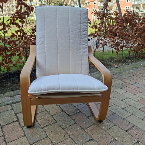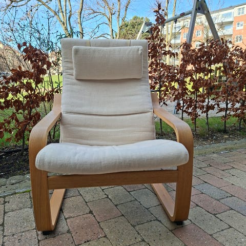 Sælger denne lænestol fra Ikea - Poäng med lav ryg i lys beige/ naturfarve. Meget behagelig at sidde i.