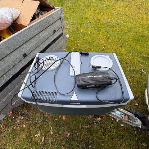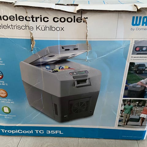 Køleboks på hjul i grå og mørkeblå plast. Boksen har integrerede hjul og håndtag i siden, så den er nem at transportere. Låget er lyst gråt, og der er ventilationsrist og rum til ledning/kabel i toppen, hvilket tyder på mulighed for elektrisk køling. Velegnet til opbevaring og nedkøling af mad og drikke på ture, camping eller i sommerhus. Størrelsen fremgår ikke præcist af billederne, men boksen fremstår rummelig.