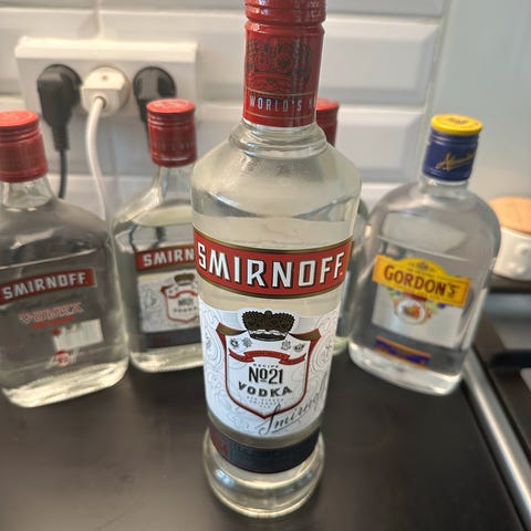 Smirnoff No. 21 vodka i klar farve. Klassisk neutral vodka, velegnet til brug i drinks og cocktails eller som ren servering. Flasken fremstår med rød og hvid etiket og skruelåg.