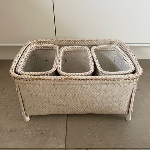 7 stk. velholdte opbevaringskasser i grå filt med træhåndtag. B 25 cm, L 35 cm, H 20 cm (incl. håndtag 24 cm). Har været brugt til tørklæder, strømper m.m.. sælges helst samlet.