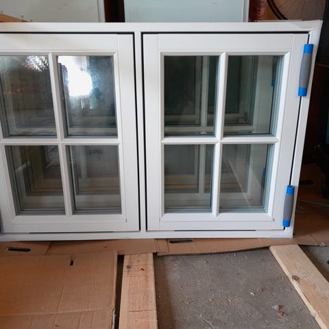 To lags trævinduer med sprosser i hvidmalet udførelse. Vinduerne har klassisk inddeling med seks ruder pr. ramme og er udført med beslag og greb i metal. Egner sig til montering i murværk eller lignende konstruktioner, f.eks. i bolig, udhus eller sommerhus, hvor der ønskes et traditionelt udtryk med sprossevinduer. Vinduerne er fra fimaet Outrup. Vinduerne er energimærke A.