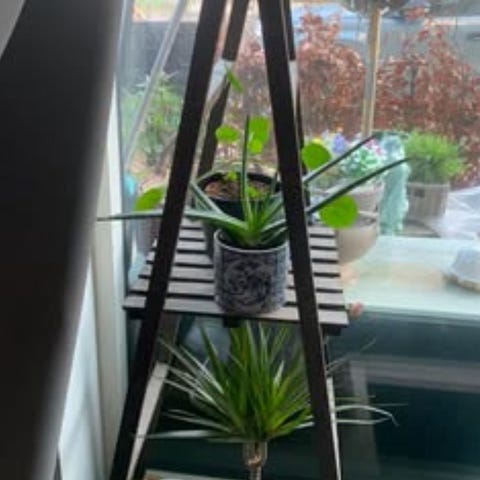Flere åbne hylder i grå metal. Reolen er egnet til opbevaring eller dekoration både inde og ude.