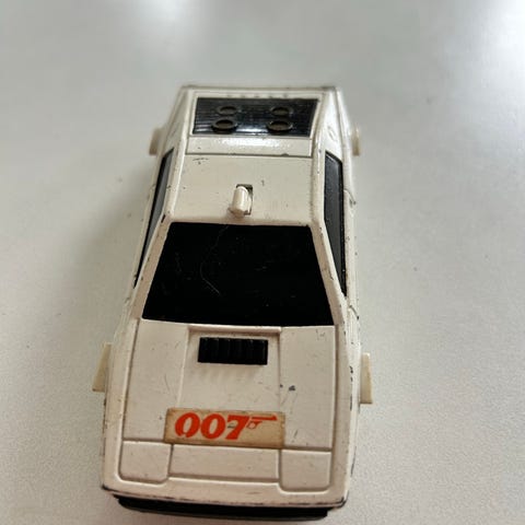 Corgi legetøjsbil i metal i hvid og rød. Modellen har påtrykte Carlsberg-reklamer på sider og motorhjelm. Carlsberg Reklamerne er fin stand, bilens alder taget i betragtning,Bilens døre kan åbne og rødt interiør med rat.