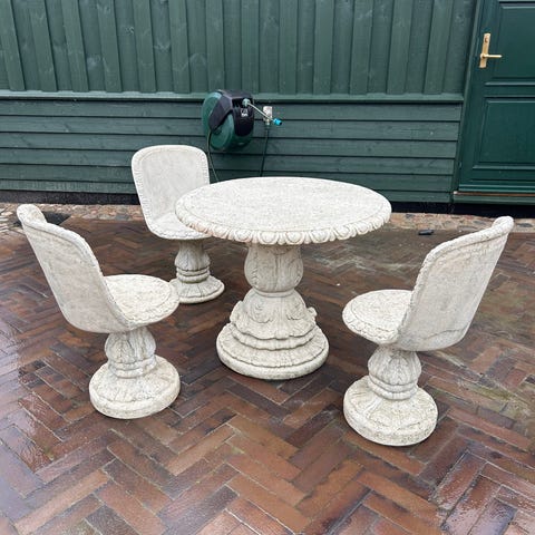 Marmorbord havebord med rektangulær, afrundet bordplade i lys marmor med grå årer, pladen kan fjernes, under pladen er der de fineste planker, som hører til det originale bord. Bordet har et dekorativt metalstel med buede ben og tværstivere, der giver stabilitet. Velegnet som udendørs havebord på terrasse eller i gårdhave. Stellet fremstår patineret med synlige spor af brug og vejr.