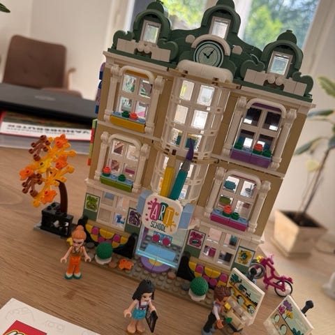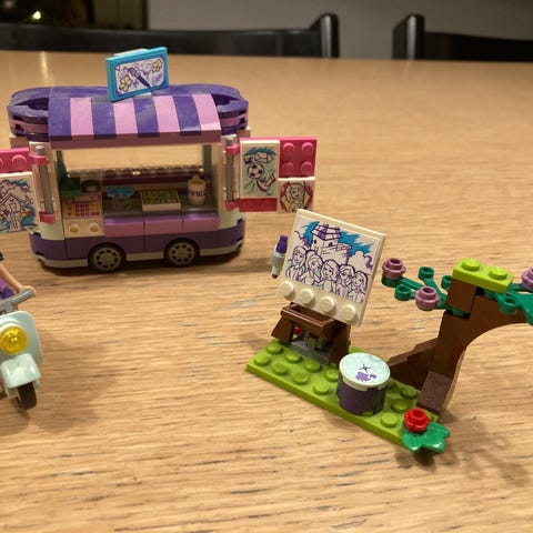LEGO Friends byggesæt med en to-etagers bygning i lilla og hvide nuancer. Sættet indeholder en butik/atelier-lignende bygning med detaljer som store vinduer, skilt, parasol på taget og indrettede rum med blandt andet staffeli, malergrej og indretningsdetaljer. Der medfølger to LEGO Friends minidukker samt små tilbehørsdele, der kan bruges til at indrette og lege forskellige hverdagssituationer i bygningen.