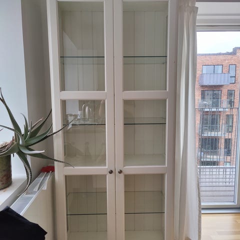 Vitrineskab til vægmontering i hvidt med to glaslåger. Skabet har to indvendige hylder.