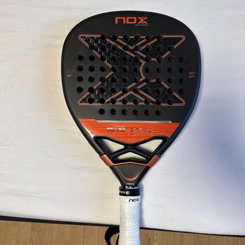 Nox EA10 Ventus Hybrid 12K Xtrem padelbat i rød farve. Battet har middelhård kerne og hybrid hovedform. Vægten er standard (ca. 360–375 g) med even balance. Rammeprofilen er 38 mm, og rammen er fremstillet i carbon. Overfladen er i 12K carbon med ru struktur. Battet er designet som allround-model til øvede spillere og turneringsspillere. Unisex-model. Cover medfølger.