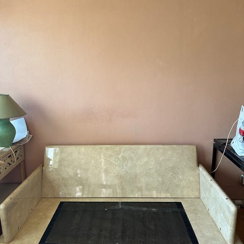 Har hund, men han er ikke i møblerne, han har dog kradset lidt på den ene side af sofaen. Trærammen trænger overordnet til en slibning og evt. lidt olie.