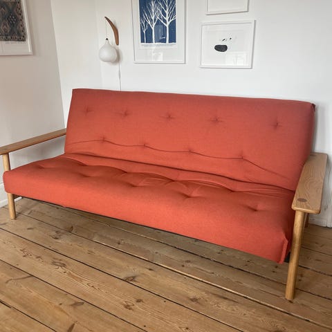 Unik sofa i træ. Købt på DBA i 2011. Fungerer fint som sovesofa, når man fjerner puderne. Betrækket kan tages af via lynlås. Lynlåsen på madrassen er dog i stykker, men kan udskiftes. Lamellerne knirker, men de kan udskiftes.