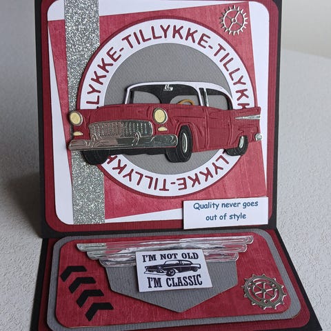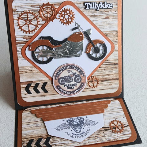 Puch Maxi håndlavet kort med knallertmotiv i grønne og røde varianter. Kortene er dekoreret med 3D-effekter som Puch-knallert foran murstensvæg, værktøj, olieflaske, pakke og teksten "Tillykke". Egnet som fødselsdagskort eller hilsen til knallertinteresserede. Fremstillet i karton og papir med detaljer i forskellige farver. Sælges