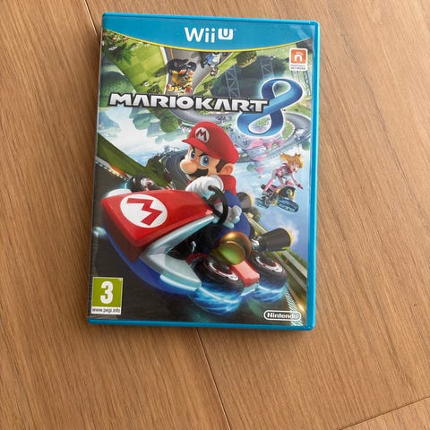 Nintendo Mario Kart 8 spil til Wii U. Fysisk udgave i blå Wii U-kasse med spildisc og trykt omslag. Spillet er et racerløbsspil i Mario-universet, hvor man kan køre på forskellige baner med figurer fra Nintendo-serier. Egnet til Wii U-konsol og markeret med aldersmærkning 3+ på coveret.