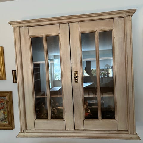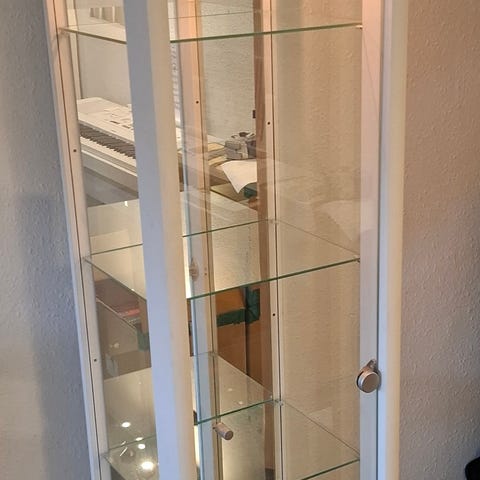 Fint hvidt vitrineskab med front og sider i glas, samt både glas- og træhylder. Glashylderne kan justeres op og ned i højden.