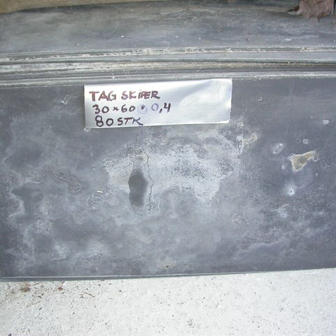 Tagplader i skifer i grå farve. Pladerne måler cirka 35 x 60 cm, som vist på billederne med tommestok. Leveres stablet på palle. Egnet til tagdækning eller andre byggeprojekter, hvor der ønskes naturmateriale i skifer.
