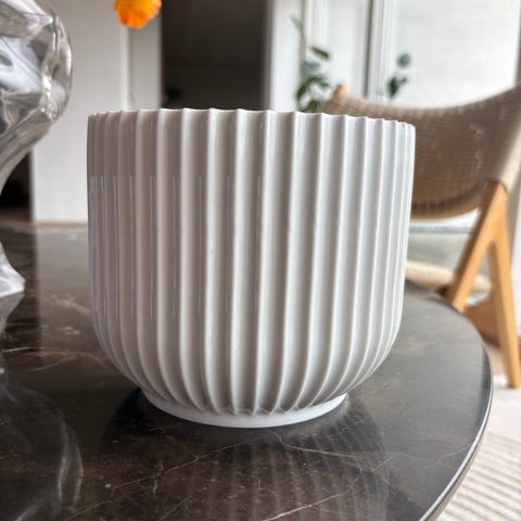Lyngby urtepotteskjuler i hvidt porcelæn. Cylindrisk form med riflede sider og glaseret overflade. Velegnet som potteskjuler til mindre planter eller som dekorativ beholder i hjemmet.