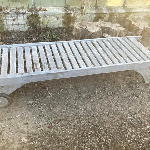 Havebænk og sofabord i teak, med grå hynder. Bænken har lamel-sæde og -ryg med armlæn i den ene side og plads til to personer. Sofabordet har matchende trælameller på bordpladen. Hynderne er i grå stof og tilpasset bænken. Sættet er egnet til terrasse eller altan.