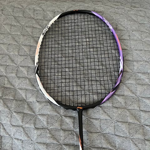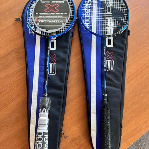 Badmintonketcher med tilhørende cover. Ketcheren har klassisk strenget hoved og greb med bånd. Der medfølger et Tecno M8 formet cover til opbevaring og transport.