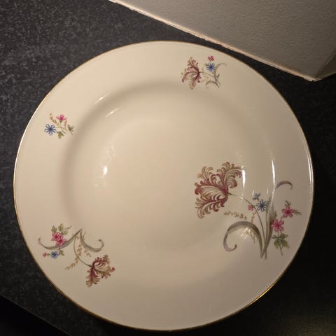 2 stk kopper med underkop og 2!Bavaria tallerken i porcelæn med dekoreret blomstermotiv i midten og guldfarvet kantdekoration. Tallerkenen har klassisk rund form og er egnet til servering af fx forret, hovedret eller dessert. Porcelænet er mærket på undersiden med Bavaria-stempel, som angiver oprindelse og materiale.