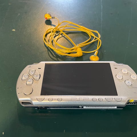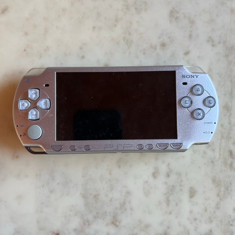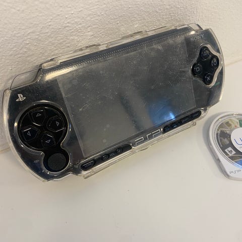 Sony PSP håndholdt spillekonsol i sort. Konsollen er designet til bærbar gaming med indbygget skærm, styrekryds, analoge knapper og funktionsknapper på fronten. Velegnet til afspilning af PSP-spil og multimedieindhold, når den er kombineret med kompatible spilmedier og tilbehør. Højre analog-pil sætter sig fast kan nemt laves ellers ingen problemer