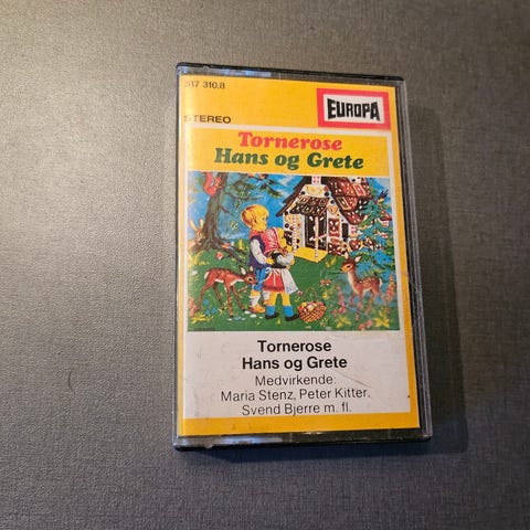 Europa Tornerose Hans og Grete kassettebånd med dramatiserede eventyr i hørespilsform. Indeholder blandt andet medvirkende Maria Stenz, Peter Kitter og Svend Bjerre. Udgivelse som en del af Europas børneserie med lydeffekter på lydkassette.