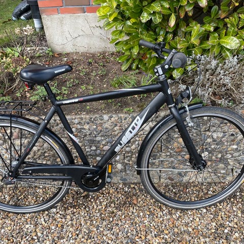 Pæn Cultima kvalitets alu cykel med 7 indvendige Shimano gear. 28 tommer hjul og 55 cm stel. Cyklen har fået 2 helt nye punkterfrie dæk, ny kæde, ny skærm, ny ringeklokke, ny fastmonteret ringlås med 2 nøgler, nye genopladelige lygter, nyt tandhjul, ny slange, ny bagagebærer, nye gear og bremse kabler og ny refleks. Derudover er der pæne Shimano rulle bremser, alu forgaffel, alu styr, alu fælge, alu pedaler, alu støtteben m.m. Håndbremse på forhjul og håndbremse på baghjul. Dækkene har en hård kerne, der gør at man næsten aldrig punkterer. Passer en person med højde på ca. 175 til 195 cm. Cyklen virker perfekt. Gearene virker selvfølgelig også, som de skal. Pæn bagkurv kan medfølge gratis. Fast pris. Mobilepay haves.