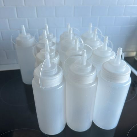 De fleste 200 ml (1/5 liter). 9 stk. klare flasker (smal prop), 4 stk brune flasker og 2 stk. klare, ca. 300 ml.