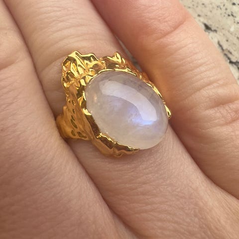 Ring, forgyldt, Maanesten, Den smukkeste ring fra Månesten. Jeg har 1 stk. tilbage, brugt få gange størrelse 59 pris fra ny 750kr.