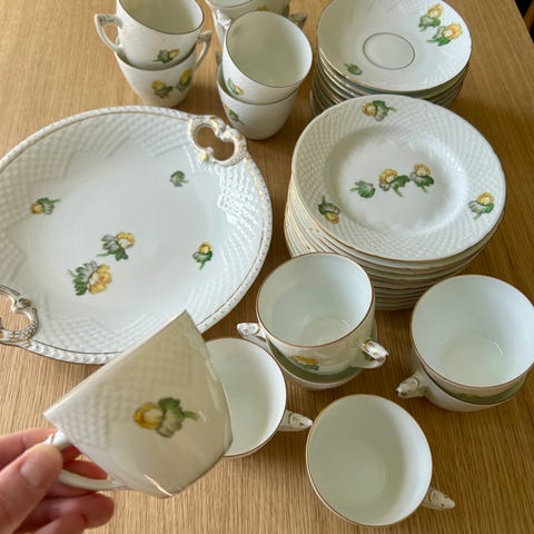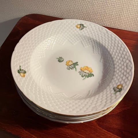 Bing & Grøndahl stel i porcelæn erantis. Sættet omfatter tallerkener i flere størrelser, kopper med underkopper, en lille kande og en skål med låg. Stellet er hvidt med gult og grønt blomstermønster og rillet kant på flere af delene. Sælges samlet og sendes ikke