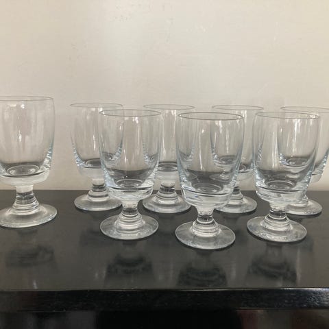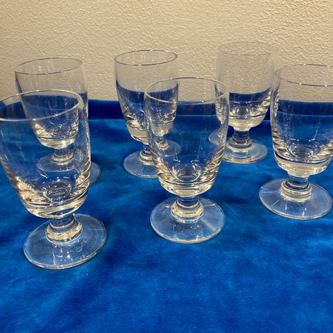 Holmegaard Almueglas på fod i klart glas. Højde 11,5 cm. 6 stk. Beskrevet som hvidvin ift glassets højde.