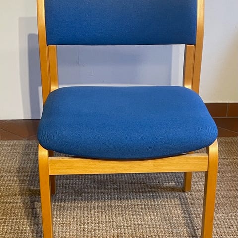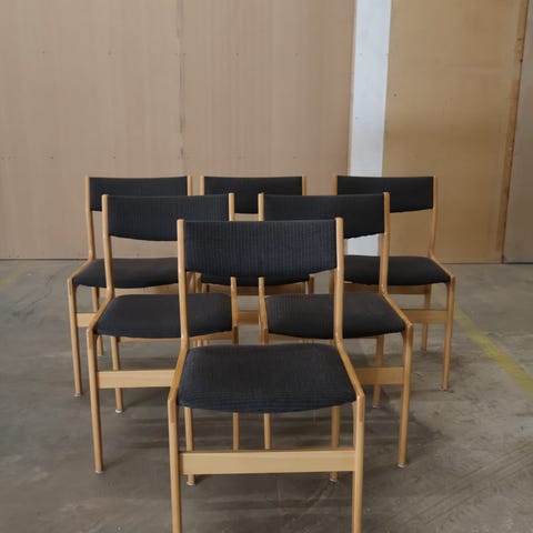 Spisestuestole i lyst træ med blå sædepuder. Fra designer Kurt Østervig.